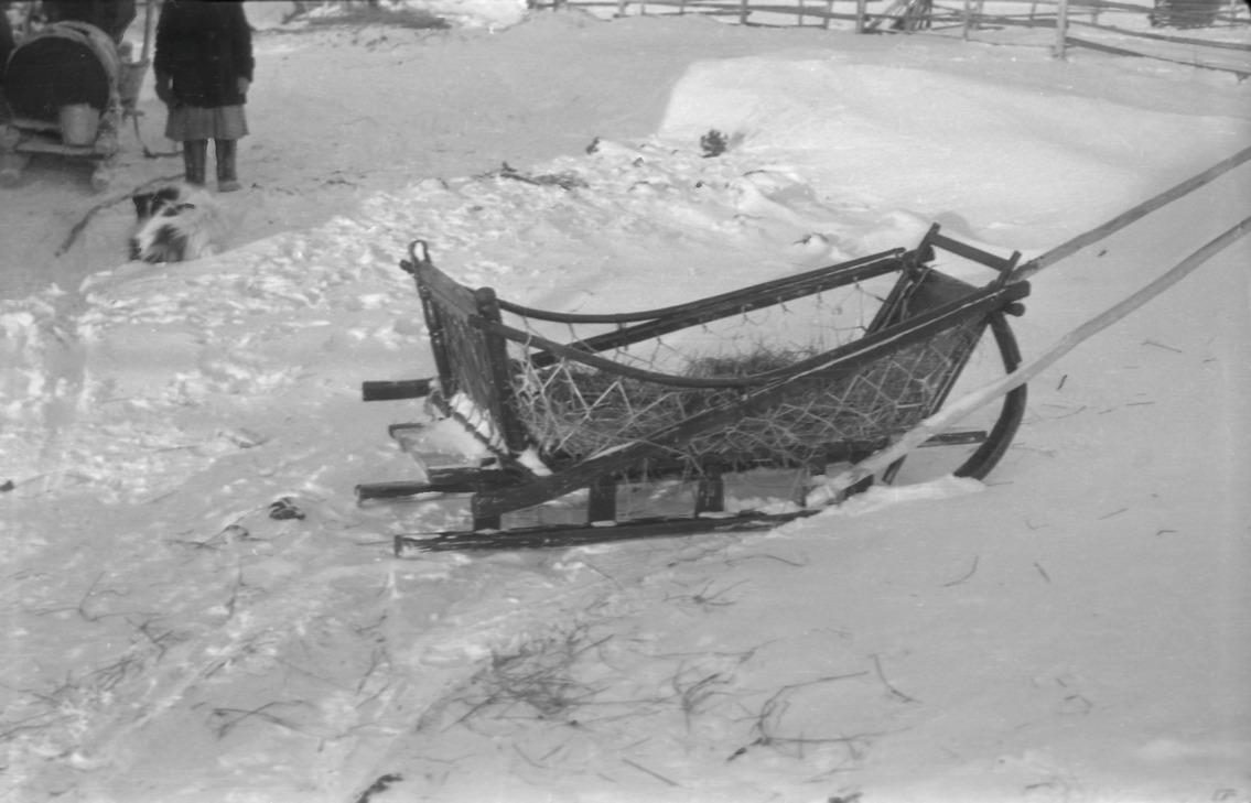 Comment (Slepenkova (Seburova) Rima Konstantinovna): Matrёna Grigor'evna Seburova's yard. Wagon sleigh. Hay in the wagon They would always put dry hay inside the sleigh, on the board, so it would be warm and soft for the passengers....show more