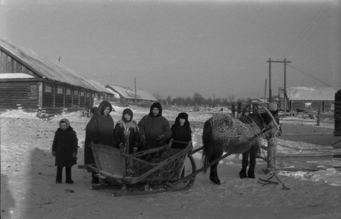 Comment (Slepenkova (Seburova) Rima Konstantinovna): The north side of the villlage, where the cattle farm of the kolkhoz is situated. The little girl: Margarita Gennadievna Griškina. Standing beside the wagon sleigh are: Gennadij Grigor’evič Griškin; Anastasija Dmitrievna Griškina (Lel'khova) - the mother of men and Matrёna Grigor'evna Seburova; Kalistrat Grigor’evič Griškin; Pavel Kalistratovič Griškin....show more