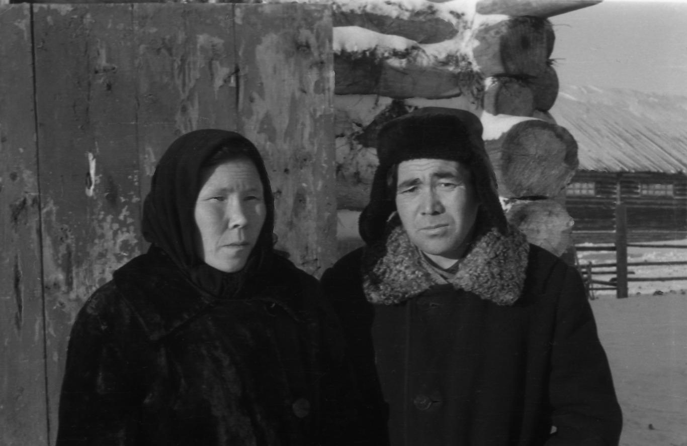 Comment (Slepenkova (Seburova) Rima Konstantinovna): Pelageja Alekseevna Griškina (Lel'khova) and her husband, Gennadij Grigor’evič Griškin. They are both wearing Russian clothes. They are standing in front of the corner of their house.