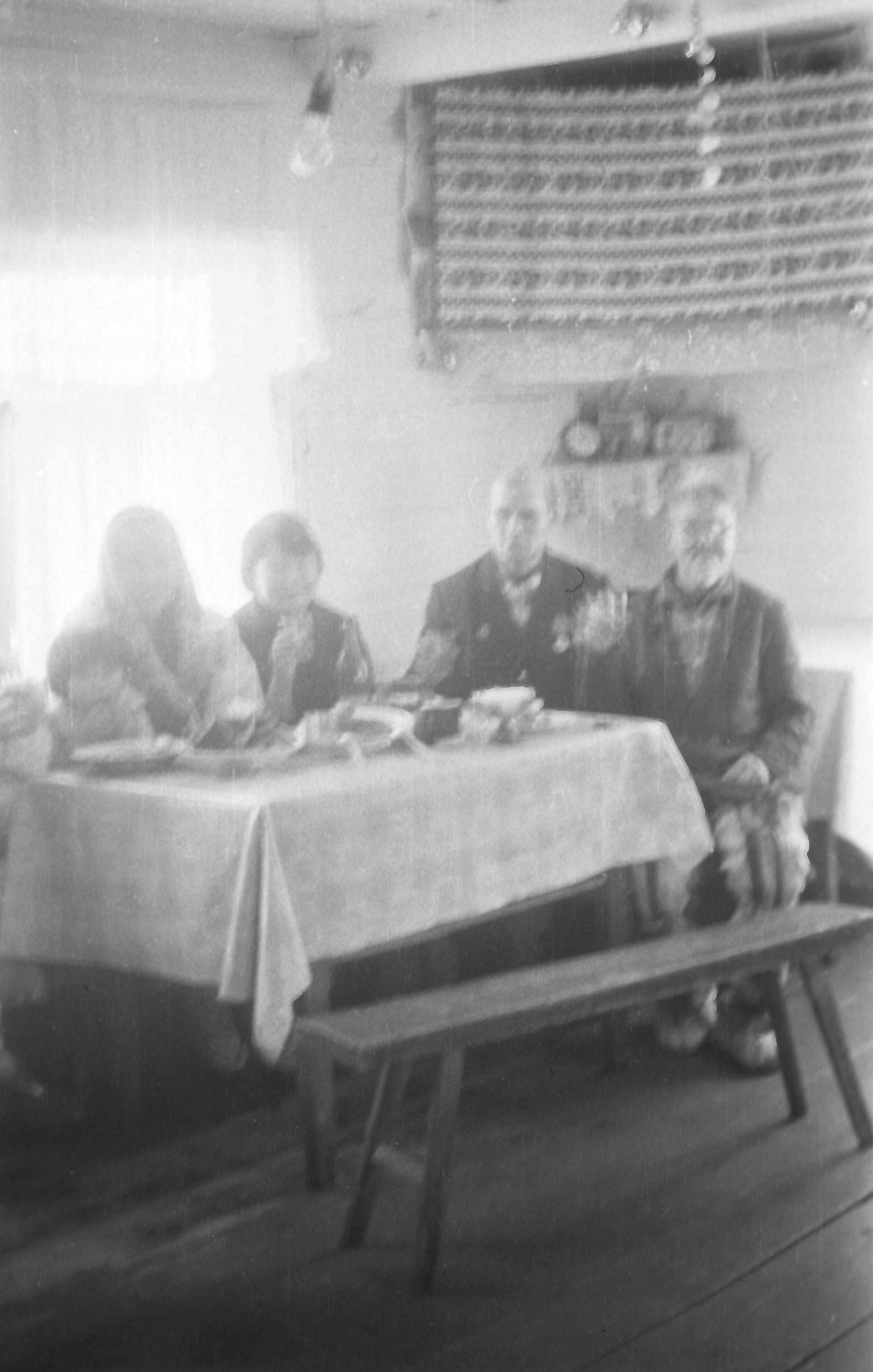 Comment (Slepenkova (Seburova) Rima Konstantinovna): Entertaining at Diomid Jegorovič Seburov's place. On the left edge, a little girl is sitting in her mother's lap. The discernible persons, Taisija Stepanovna Seburova, Daniil Mitrofanovič Kaksin and Diomid Jegorovič Seburov are sitting at the table....show more