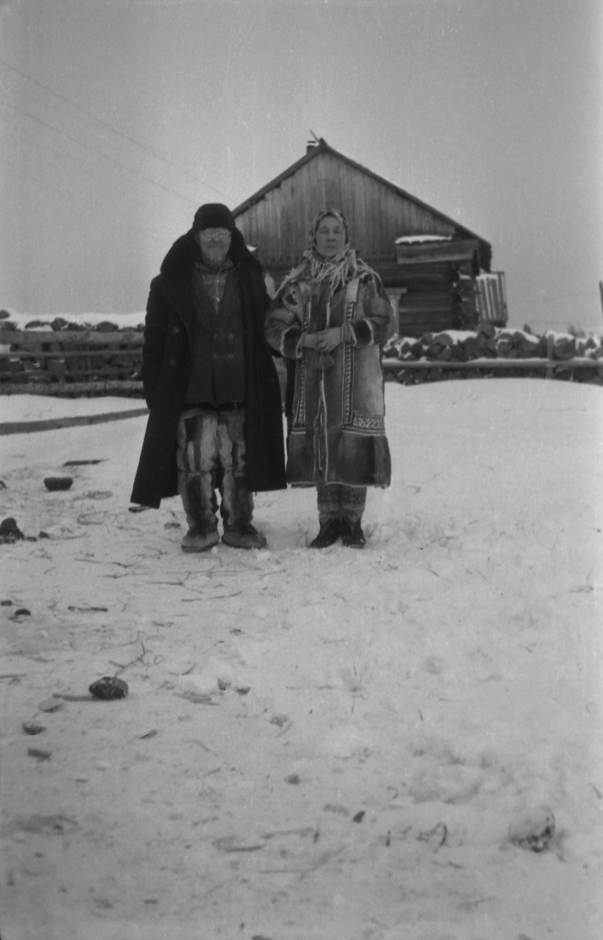 Comment (Slepenkova (Seburova) Rima Konstantinovna): Diomid Jegorovič Seburov is wearing Russian clothes, on her feet he has wej, ’high fur boots’, which were gifted to him by his son-in-law, Daniil Mitrofanovič Kaksin. Matrёna Grigor'evna Seburova (Griškina) has a scarf on her head, wears a săχ, ’women's fur coat’ with ornamental motives, on her legs she has Khanty sejəm wej, ’knitted stockings’, and on her feet slip-on shoes. In the background, we see the house of Aleksej Diomidovič Seburov - Diomid Jegorovič Seburov's son.
