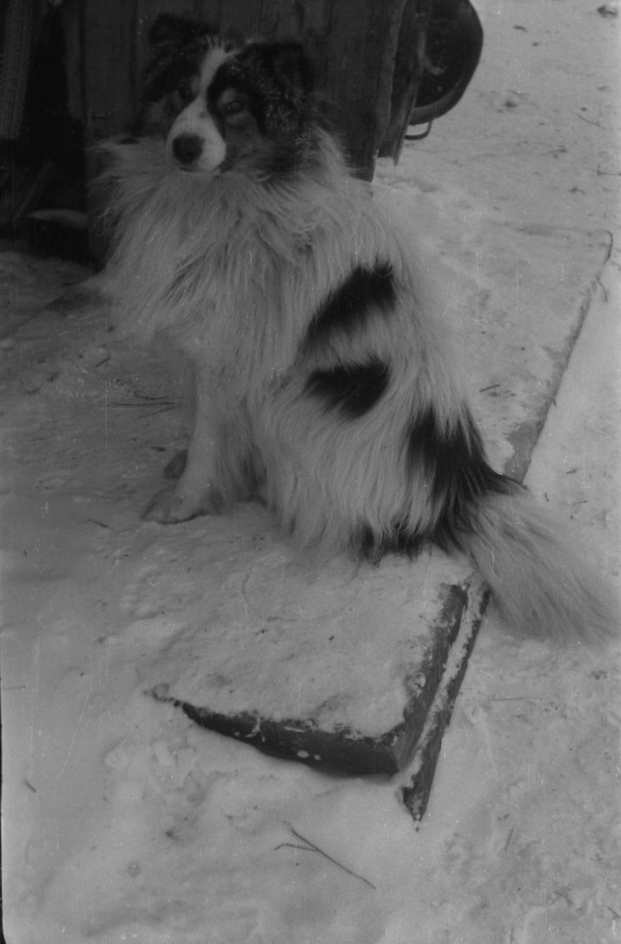 Comment (Slepenkova (Seburova) Rima Konstantinovna): A dog is sitting in front of the entrance to the house of Matrёna Grigor'evna Seburova (Griškina). It is looking at the photographer watchfully. The door is open towards the hallway.