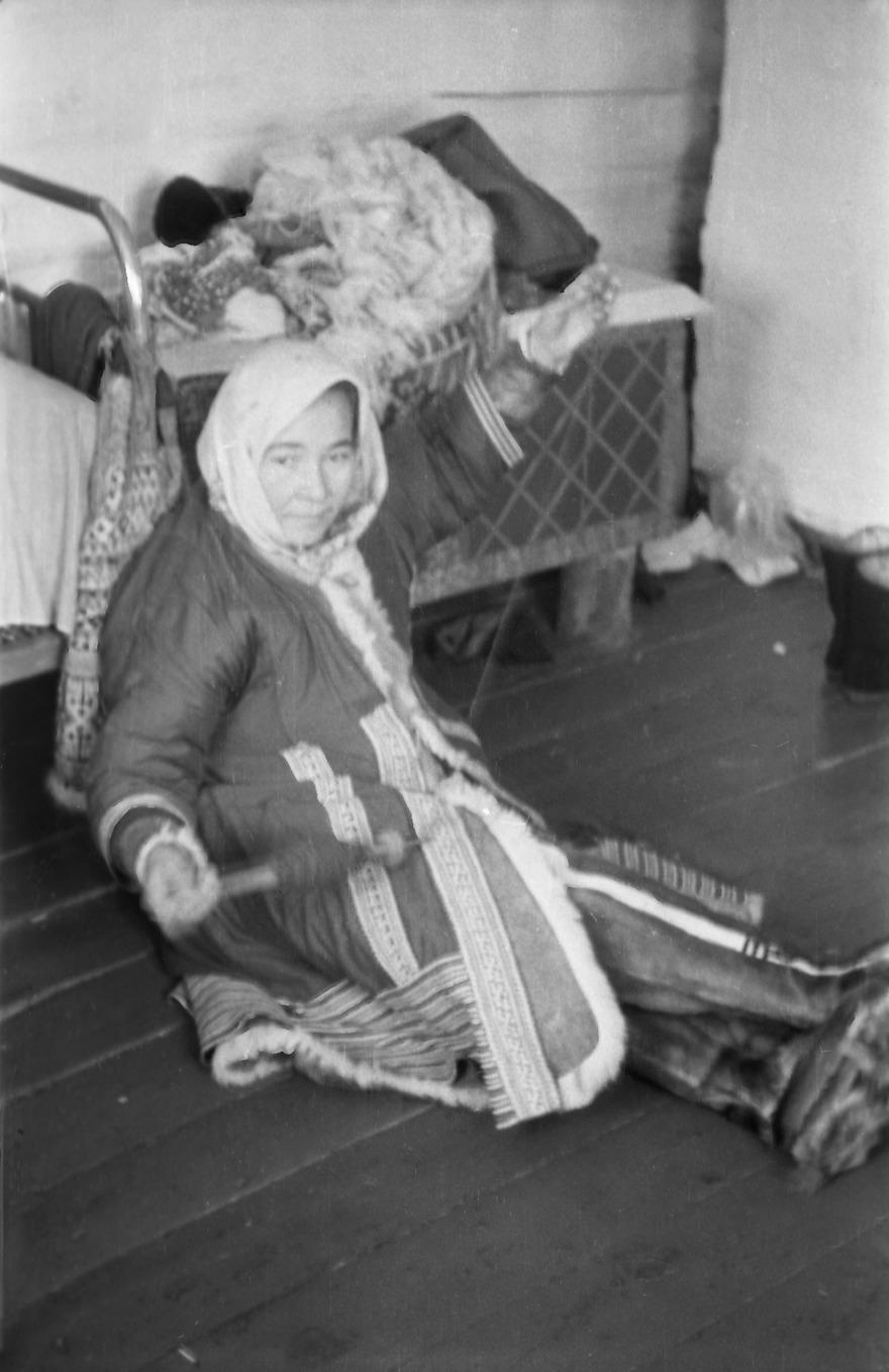 Comment (Slepenkova (Seburova) Rima Konstantinovna): Spinning with a hand spindle. Vera Grigor'evna is sitting on the floor, spinning the hair with a hand spindle (jeŋt). Vera Grigor'evna is wearing a fur coat (săχ ’women's fur coat’), on her head is a linen scarf, on her feet high boots (wej) sewn from reindeer leg fur....show more