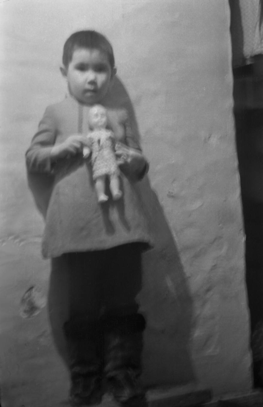 Comment (Slepenkova (Seburova) Rima Konstantinovna): Little girl in Russian clothing, sitting on a homemade stool. On her feet she has short boots sewn from calf fur. She is holding a doll.