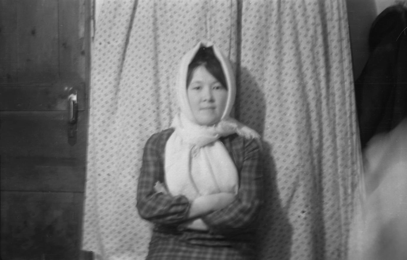 Comment (Slepenkova (Seburova) Rima Konstantinovna): Girl is standing with a wool scarf on her head, her arms folded. She is wearing Russian clothes.